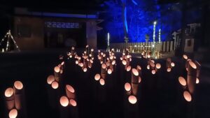 この竹明かりは新嘗祭(にいなめさい)に合わせて行われています。今年は11月21日(金)~ 3日間行われました。夜の神社というと、初詣くらいしか行くことはないかもしれませんが、たくさんの竹明かりに火が灯るところは一見の価値があると思います。