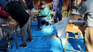 直接は関係ありませんが、2025年11月8日(土)に行われた「子ども流鏑馬礼法講習会」の横では、竹明かりの奉納が行われていました。奉納といっても特別な儀式が行われるのではなく、竹明かりで使用する模様の入った竹を作成していただきます。10㎝ ~ 15㎝位の太さの青竹に、穴をひたすらあけていきます。穴の大きさも模様に合わせて3種類くらい使い分けますので、その都度ドリルを付け替えていきます。