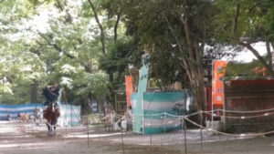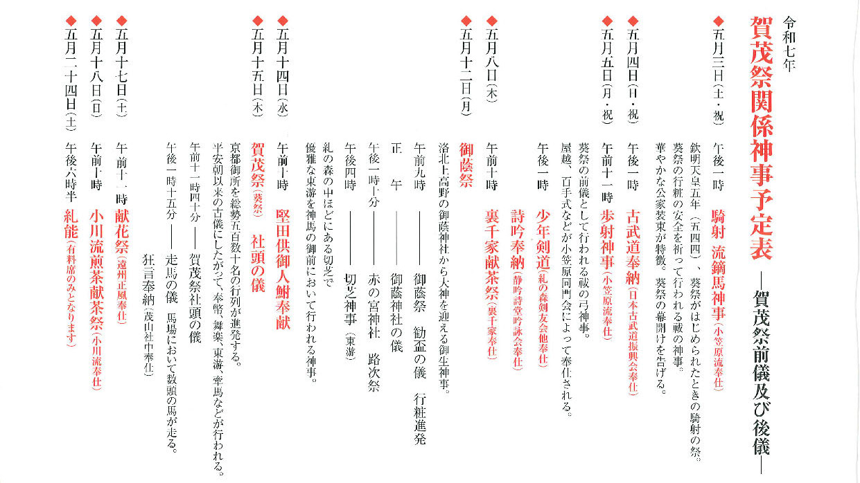 下鴨神社(しもがもじんじゃ)という名前は通称で、賀茂御祖神社(かもみおやじんじゃ)が正式な名前だそうです。「賀茂祭」は令和7年度は 5月3日(土)~ 5月24日(土)のスケジュールで行われました。この始まりに行われるのが、流鏑馬神事です。このお祭りは、別名「葵祭」とも呼ばれ、境内に入る鳥居のわきに葵の木があったり、神事で葵の小枝を身にまとっていたりと、歴史的な背景を感じます。また、射手の装束も他と違う様式だったりします。そんな歴史的な由来等につきましては、下鴨神社のホームページに詳しく掲載されていますので、ご一読いただけたらと思います。