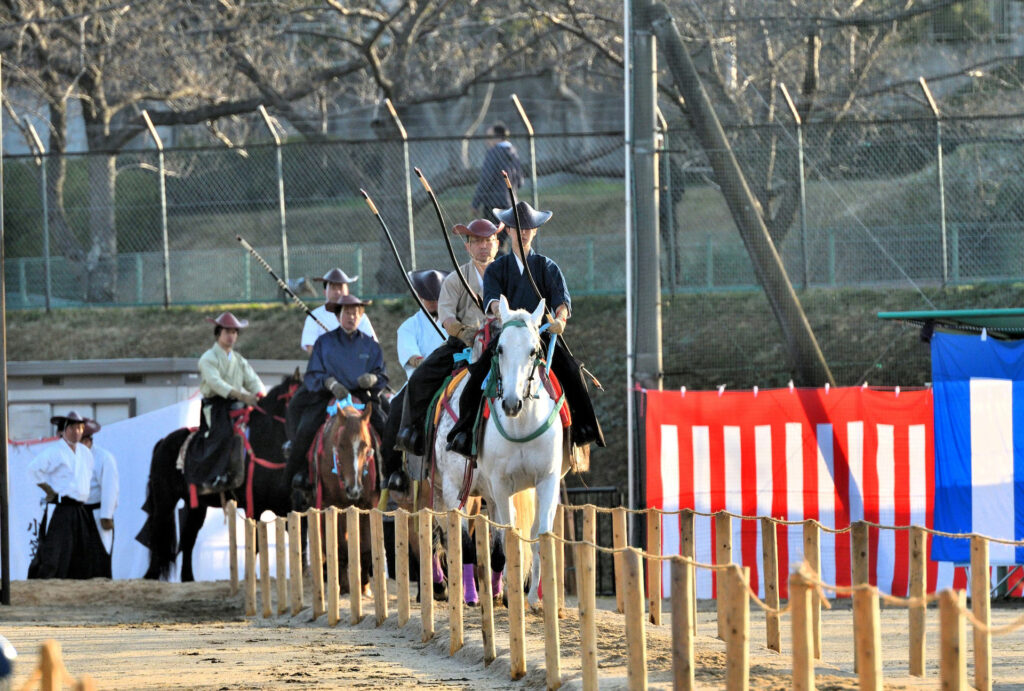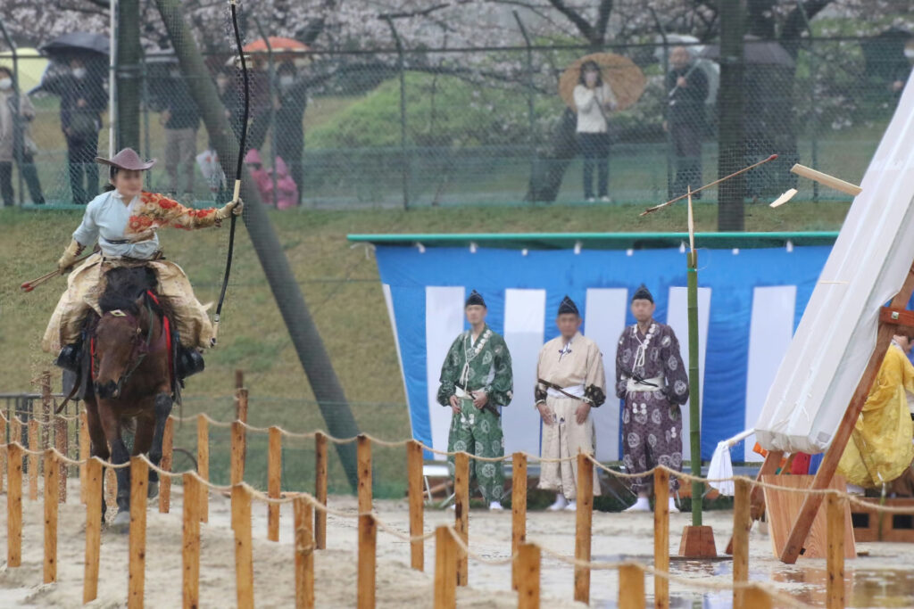 <2026年1月10日> この写真は、第3回流鏑馬まつり当日の一場面です。雨に濡れた馬場、緊張感のある空気の中で、射手は馬上から矢を放ちます。 ここに至るまでには、馬に乗らない日の稽古、木馬での練習、礼法や朝練など、静かな時間が幾重にも積み重なっています。 当日は、その積み重ねが一気に試される日です。うまくいくこともあれば、思うようにいかないこともある。それでも射手は、これまでの稽古を信じて、この場に立ちます。 華やかに見える流鏑馬の一瞬は、決してその場限りのものではありません。長い稽古の時間があってこそ、初めて成立します。 こうした準備と積み重ねを続けることができているのは、皆さまのご支援があってこそです。稽古の時間も含めて、流鏑馬まつりを支えていただいています |
