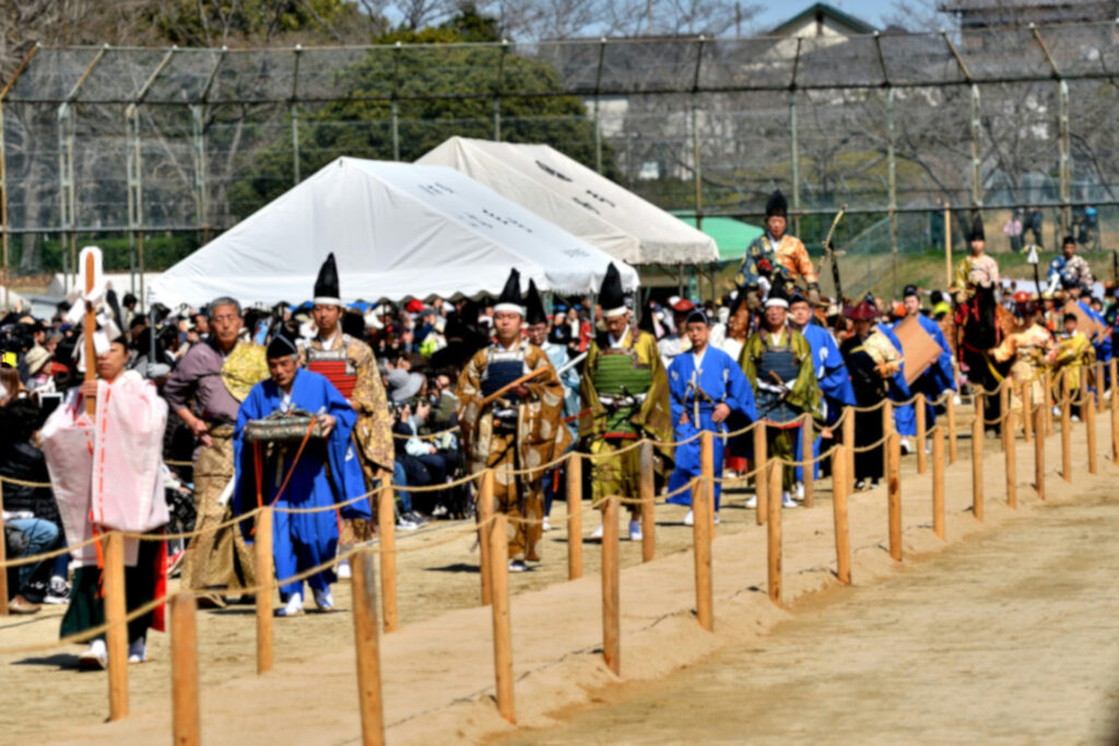 <2026年1月21日> 第2回流鏑馬まつり、入場の場面です。 美多彌神社での神事を終え、幣振(へいふり)や覧筥(らんばこ)を担う諸役、そして馬上の流鏑馬射手が、馬場末へと進んでいきます。 華やかな射の直前、場の空気が静かに張りつめる時間。 この入場から、流鏑馬は始まります。 この緊張と高揚の瞬間を、皆さまと共にまつりの場で体験したいと考えています。その実現のため、ご支援をお願いいたします。